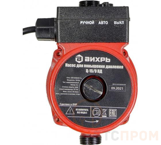 Циркуляционный насос Вихрь Ц-15/9 ПД обеспечит повышение давления воды в отопительной системе, а также в трубопроводах водоснабжения. Используют такие устройства и в промышленных системах охлаждения. Насос рециркуляции компактен. Перекачка воды осуществляется за счет вращения электрическим двигателем рабочего колеса. Параметры модели Вихрь Ц-15/9 ПД: Мощность устройства составляет 120 Вт. Температура жидкости, перекачиваемой по системе может варьироваться в пределах от -10 до +110 ?. На корпусе расположена ручка переключения режимов, которых 3 (Выкл, Авто и Ручной). Подшипники и вал ротора выполнены из высококачественной керамики. Это делает работу насоса бесшумной и долговечной. Насос не нуждается в обслуживании, поскольку смазка и охлаждение подшипников происходит с помощью перекачиваемой воды. Рабочее колесо не окислится и не застрянет при длительном простое, так как при его производстве используются полимерные материалы. Стравливать воздух из системы можно, открутив заглушку ротора. Крышка насоса выполнена из чугуна, а корпус из алюминия. Циркуляционный насос Вихрь Ц-15/9 ПД – обязательный и эффективный компонент систем отопления и водоснабжения. Его приобретают в частный дом или коттедж. Простая конструкция наряду с качественными комплектующими делают его надежным и долговечным.