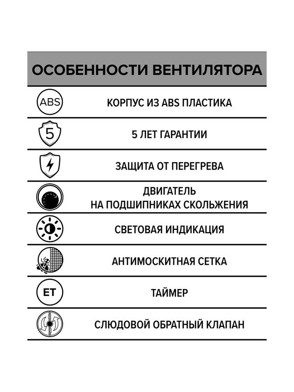 Вентилятор ERA 4S ЕТ применяется для постоянной и периодической вентиляции санузлов, душевых и ванных комнат, кухонь и других бытовых помещений. Модель имеет антимоскитную сетку. Также ERA 4S ЕТ оснащен двухрежимныйм таймером, с помощью которого задается длительность работы вентилятора. Время устанавливается пользователем в диапазоне от 15 сек до 45 мин. А с помощью предохранителя от перегрева, останавливает работу вентилятора в целях электро- и пожаробезопасности при температуре двигателя +115°C - +125°C. Лицевая панель, корпус и крыльчатка изготовлены из сверхпрочного Abs-пластика, который не подвержен старению и прослужит весь срок использования. Имеет световую индикацию работы. Благодаря стильному дизайну данная модель идеально дополнит любой интерьер.