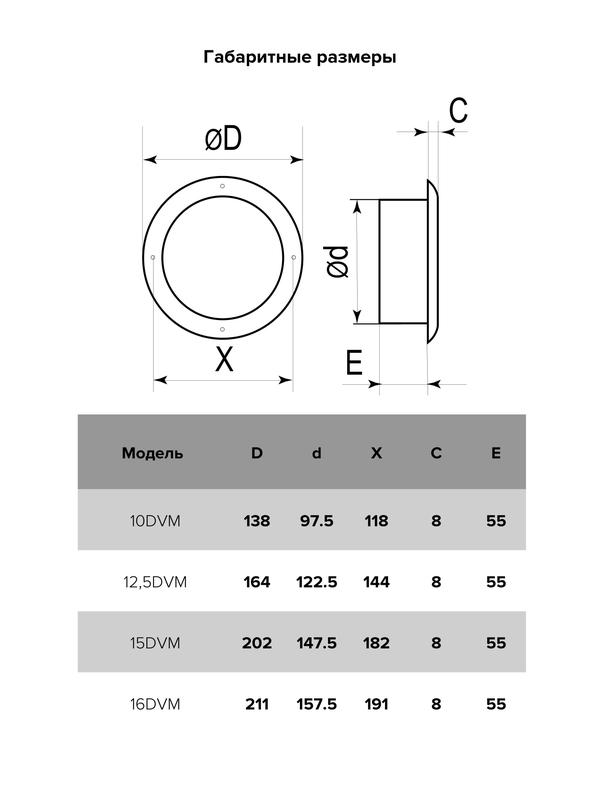 DVM предназначен для вытяжных систем вентиляции, устанавливается в стену или подвесной потолок. Анемостат изготавливается из стали с покрытием полимерной эмалью, поэтому подходит для помещений с повышенной температурой. Монтируется с круглым воздуховодом при помощи фланца.
