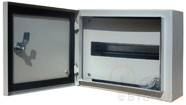 Щит распределительный серии ЩРН Dekraft; навесной; номинальный ток до 125 А; исполнение – 12 мод. х 18 мм, 1 ряд; ВхШхГ - 250х300х120 мм; материал – сталь; цвет - серый (RAL 7035); степень защиты – IP54. Щиты ЩРН имеют встроенные DIN-рейки для модульной аппаратуры, элементы крепления шин N и PE, болты заземления на дверце и на корпусе, дверь с замком и ключом. Доступ к токопроводящим частям закрыт съемной фальшпанелью. Ввод кабелей для всех щитов осуществляется сверху или снизу.
