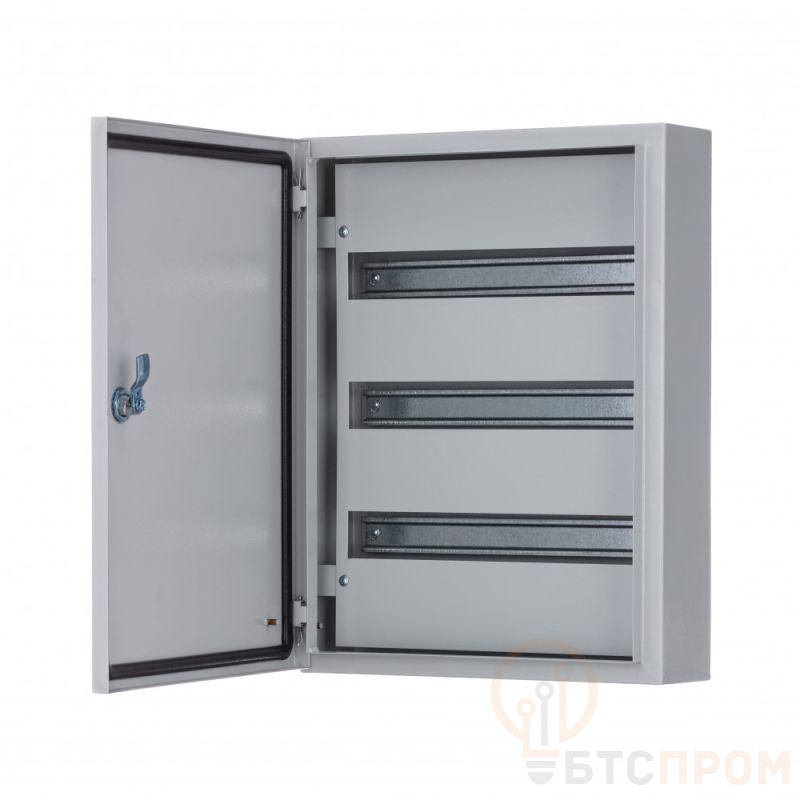 Щит распределительный серии ЩРН Dekraft; навесной; номинальный ток до 125 А; исполнение – 54 мод. х 18 мм, 3 ряда по 18 мод. каждый; ВхШхГ - 520х400х120 мм; материал – сталь; цвет - серый (RAL 7035); степень защиты – IP54. Щиты ЩРН имеют встроенные DIN-рейки для модульной аппаратуры, элементы крепления шин N и PE, болты заземления на дверце и на корпусе, дверь с замком и ключом. Доступ к токопроводящим частям закрыт съемной фальшпанелью. Ввод кабелей осуществляется только снизу.
