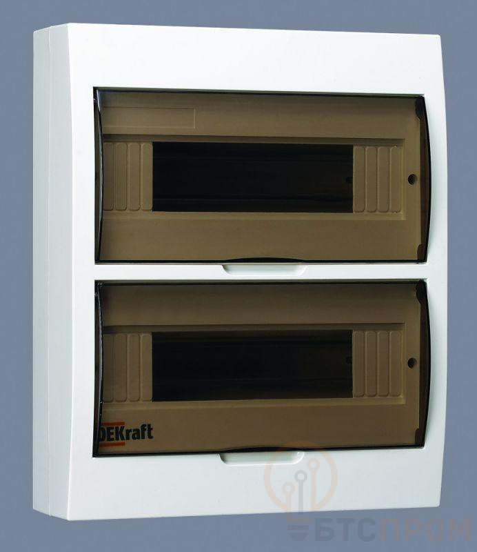 Корпус пластиковый навесной для электрических аппаратов серии ЩРН-П IP41 используют для установки в них модульной защитной аппаратуры. Дизайн корпуса имеет элегантные и скругленные формы, как и дверца, ее цвет темное органическое стекло. Фронтальные части корпуса, дверца, основание корпуса изготавливаются из самозатухающего ABS-пластика. Корпус имеет штампованные вводы для кабелей с разных сторон, и расстояния до точек крепления указаны сзади. Корпус является встраиваемым, имеет 2 черных DIN-рейки и 24 модулей (18 мм) для установки устройств, изолированные держатели для шинок, шинки N и PE. Дверцы на каждый ряд фиксируются в верхнем положении. Щиток на 100% совместим с модульным оборудованием Dekraft и Systeme Electric.