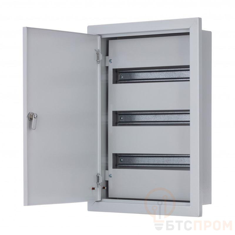 Щит распределительный серии ЩРВ Dekraft; встраиваемый; номинальный ток до 125 А; исполнение – 45 мод. х 18 мм, 3 ряда по 15 мод. каждый; ВхШхГ - 550х380х120 мм; материал – сталь; цвет - серый (RAL 7035); степень защиты - IP31. Щиты ЩРВ имеют встроенные DIN-рейки для модульной аппаратуры, элементы крепления шин N и PE, болты заземления на дверце и на корпусе, дверь с замком и ключом. Доступ к токопроводящим частям закрыт съемной фальшпанелью. Ввод кабелей осуществляется сверху или снизу.
