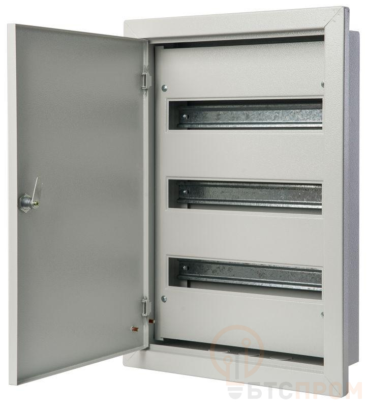 Щит распределительный серии ЩРВ Dekraft; встраиваемый; номинальный ток до 125 А; исполнение – 54 мод. х 18 мм, 3 ряда по 18 мод. каждый; ВхШхГ - 550х430х120 мм; материал – сталь; цвет - серый (RAL 7035); степень защиты - IP31. Щиты ЩРВ имеют встроенные DIN-рейки для модульной аппаратуры, элементы крепления шин N и PE, болты заземления на дверце и на корпусе, дверь с замком и ключом. Доступ к токопроводящим частям закрыт съемной фальшпанелью. Ввод кабелей осуществляется сверху или снизу.