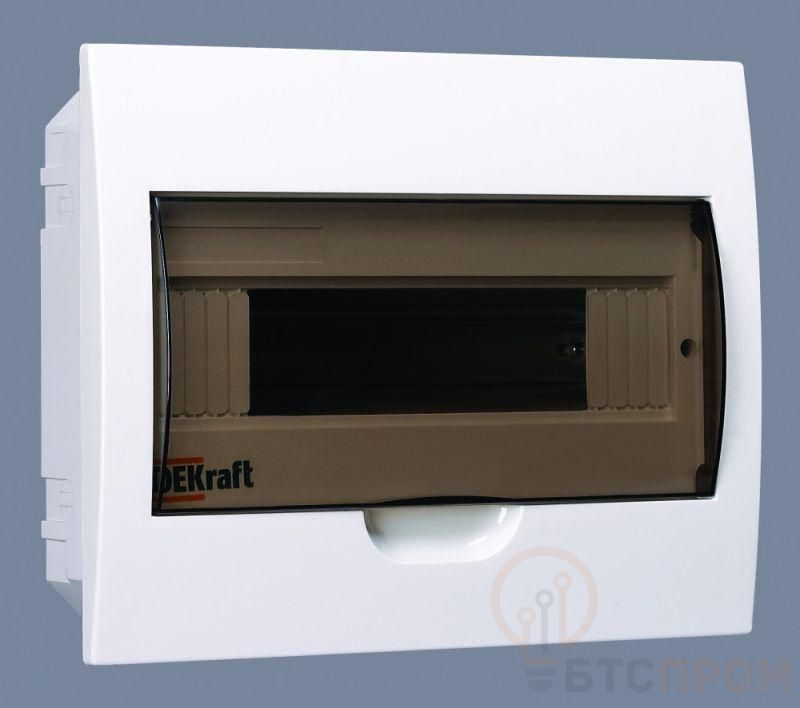 Корпус пластиковый встраиваемый для электрических аппаратов серии ЩРВ-П IP41 используют для установки в них модульной защитной аппаратуры. Дизайн корпуса имеет элегантные и скругленные формы, как и дверца, ее цвет темное органическое стекло. Фронтальные части корпуса, дверца, основание корпуса изготавливаются из самозатухающего ABS-пластика. Корпус имеет штампованные вводы для кабелей с разных сторон. Корпус является встраиваемым, имеет 1 черную DIN-рейку и 12 модулей (18 мм) для установки устройств, изолированный держатель для шинок, шинки N и PE. Дверца фиксируется в верхнем положении. Щиток на 100% совместим с модульным оборудованием Dekraft и Systeme Electric.