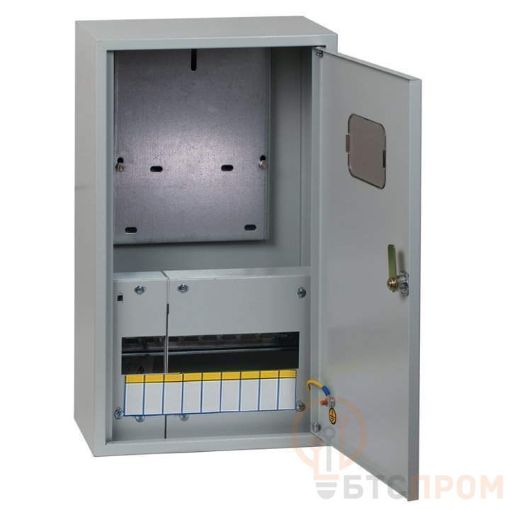Элемент щитового оборудования. Навесной, с дверцей и замком. Изготовлен из металлического сплава, серого цвета. Размеры: 400 х 300 х 140 мм. Защищен от проникновения пыли и вертикальных капель (IP31). Возможно подключение 9 модулей.