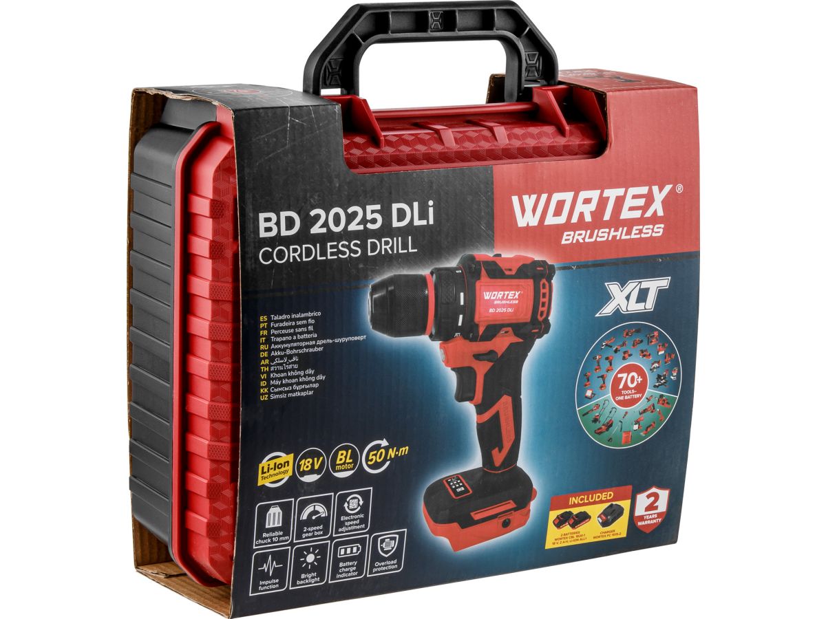 Модель WORTEX BD 2025 DLi оснащена надежным бесщеточным двигателем, что продлевает срок службы как самого инструмента, так и аккумуляторов в 2 раза; снижает энергопотребление на 50%; делает инструмент компактнее, а работу продуктивнее; исключает необходимость замены угольных щеток.