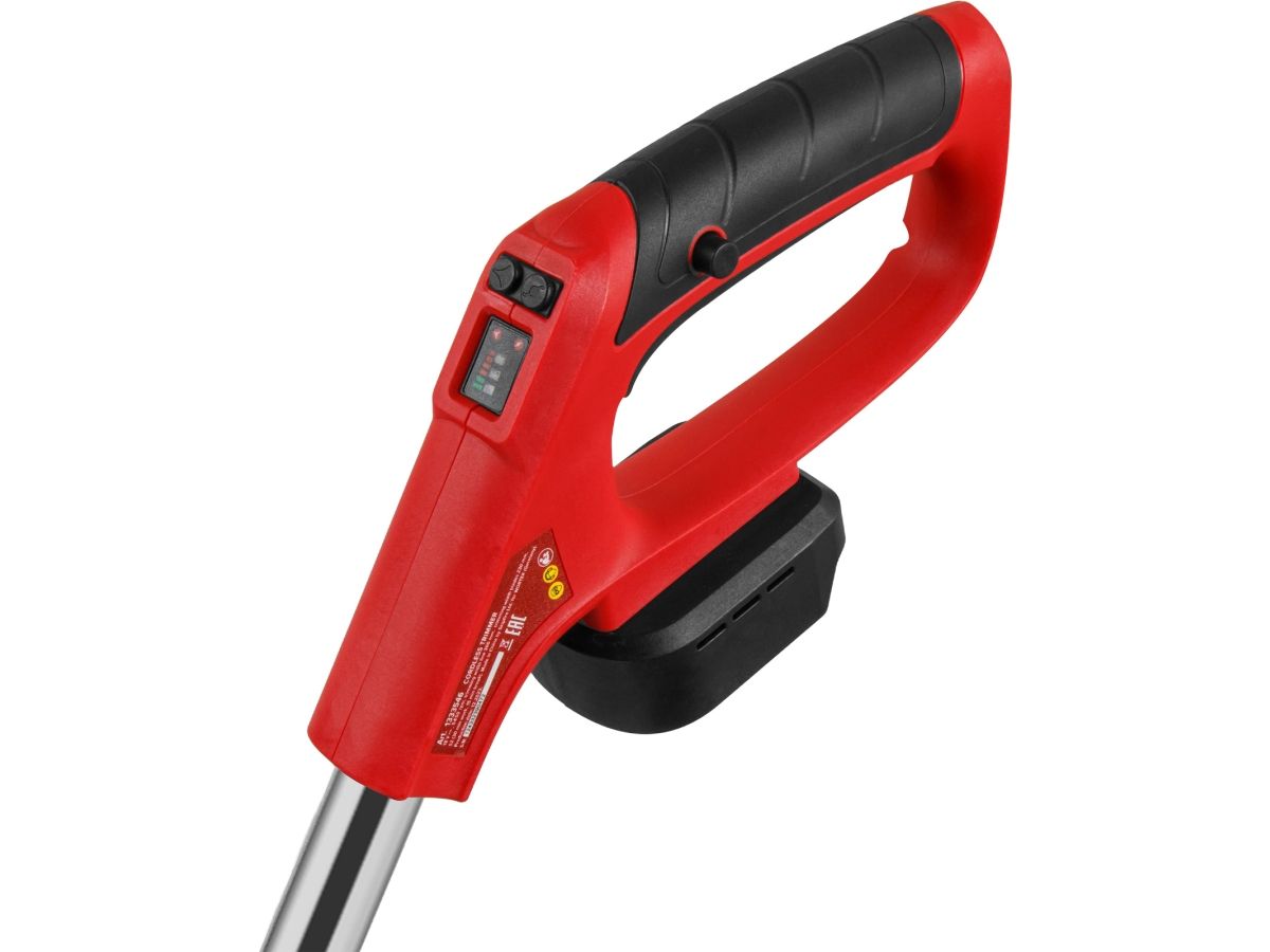 На рукоятке расположен индикатор заряда аккумулятора, а также кнопки переключения для работы ножом или косильной головкой.