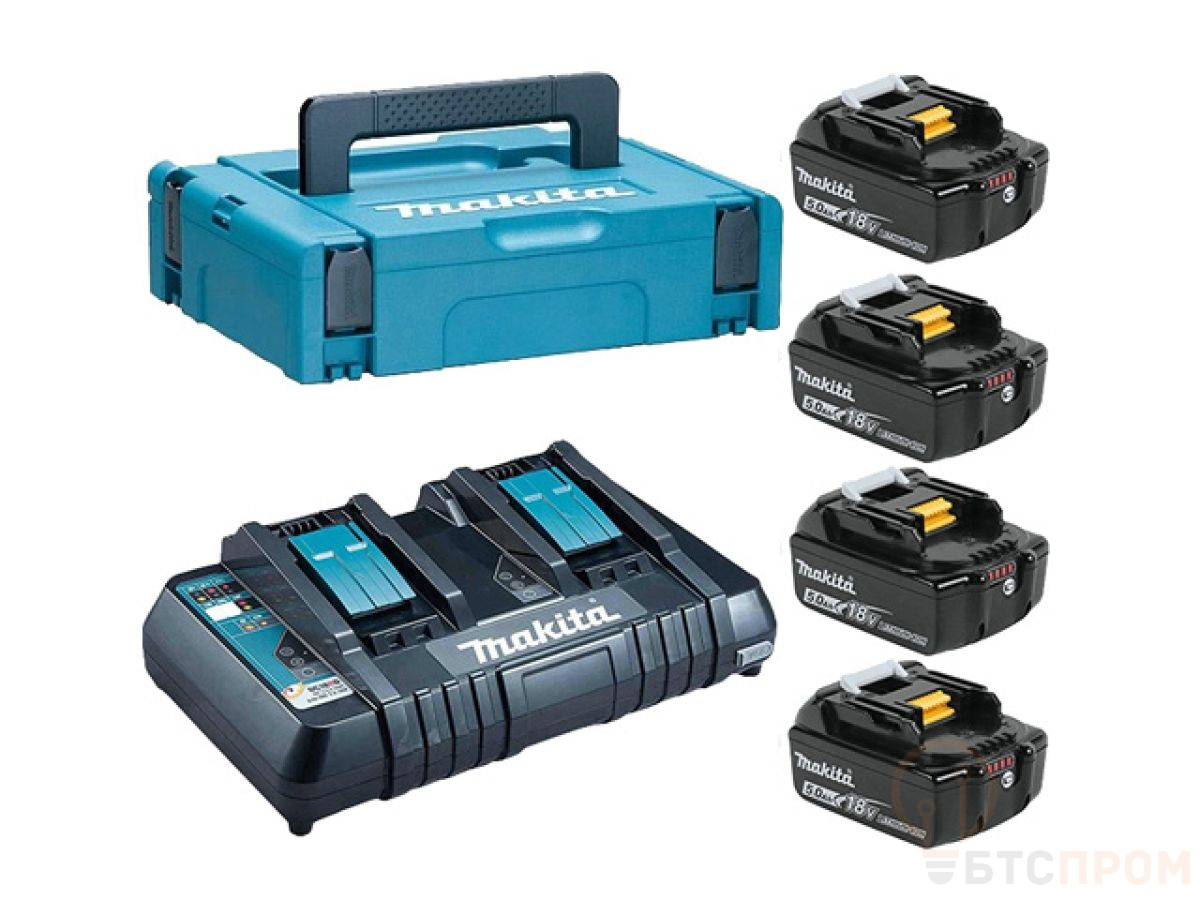 Набор Makita 198312-4 состоит из четырех аккумуляторных батарей BL1850B и зарядного устройства DC18RD. В комплектацию входит также практичный пластиковый систейнер типа MakPac.
