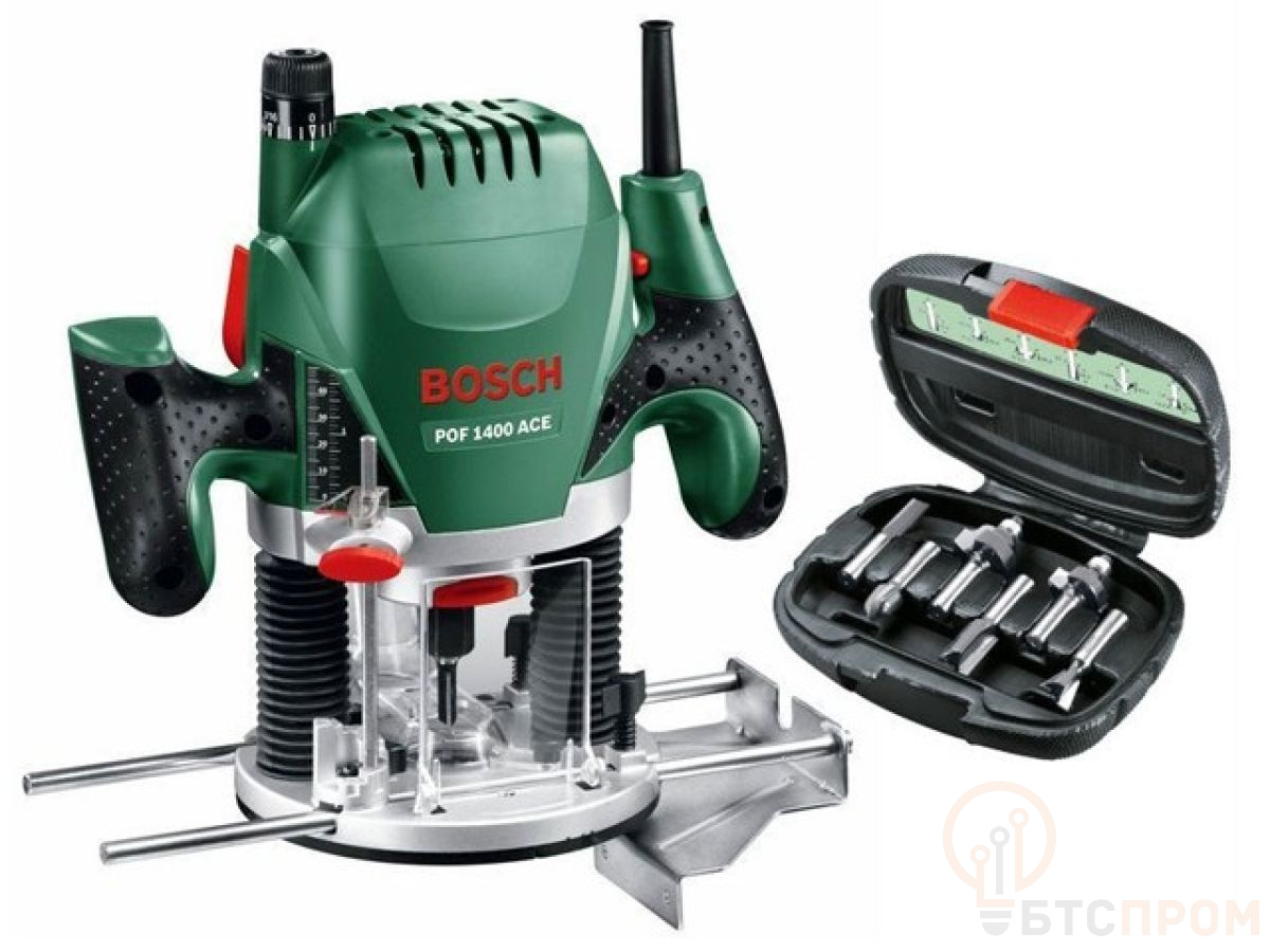 Фрезер вертикальный BOSCH POF 1400 AСE в чем. + набор фрез (1400 Вт, цанга 6/8 мм, 28000 об/мин, регул. об.) 060326C801