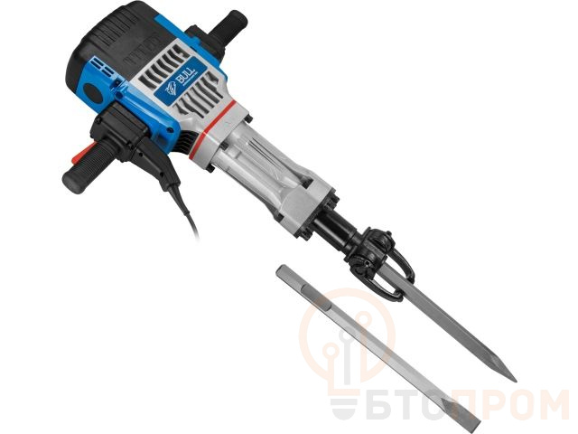 Отбойный молоток предназначен для дробления бетона, слома бетонных покрытий, проделывания проёмов, а также ведения самых сложных демонтажных работ. Шестигранный патрон НЕХ 28 мм позволяет надежно фиксировать долота, а также обеспечить удобство смены. Модель обладает особой системой системой виброгашения, что делает работу менее утомительной для оператора. Корпус редуктора изготовлен из магниевого сплава, что обеспечивает дополнительную защиту внутренних узлов, а также лучший отвод тепла. Обладает оптимальным удобством использования: эргономичные рукоятки с мягкой накладкой и низко расположенный центр тяжести инструмента обеспечивают оптимальный комфорт в использовании. Отбойный молоток BULL также имеет морозоустойчивый резиновый кабель 5 м.