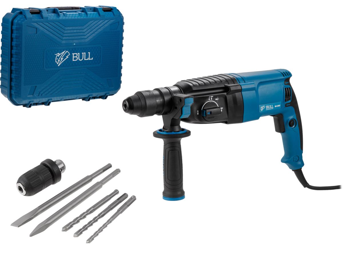 Перфоратор BULL BH 2602 в чем. 800 Вт, 3.0 Дж, 4 реж. + 2 зубила, 3 сверла, БЗП в комплекте (800 Вт, 3.0 Дж, 4 реж., патрон SDS-plus, БЗП в комплекте, вес 3.4 кг) 01045325