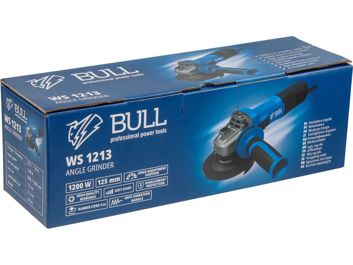 Одноручная углошлифмашина BULL WS 1213 в кор. 125 мм, 1200 Вт, плав. пуск., рег. об, конст. эл. (3000 - 11 000 об/мин, защита от перегрузки, защита от повторного включения, вес 2,45 кг) 1333514