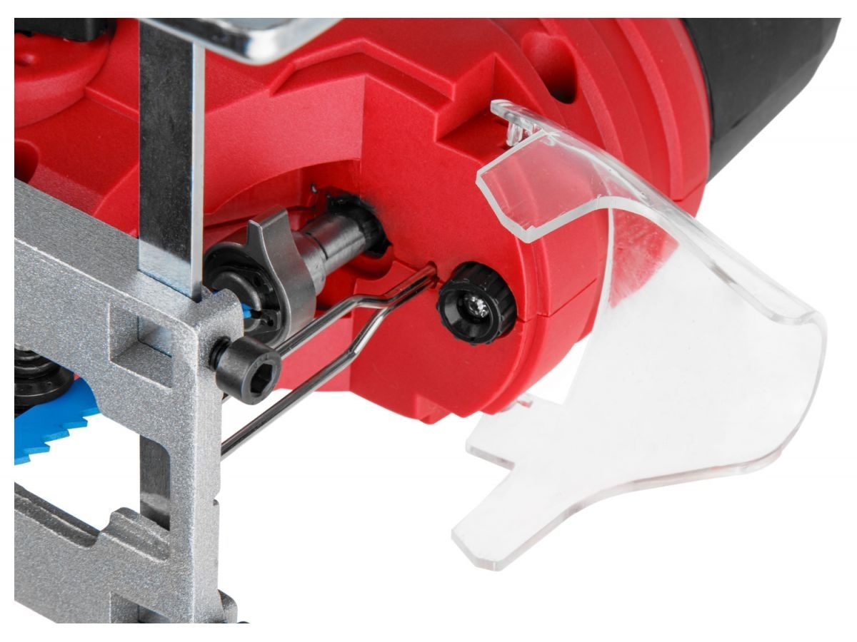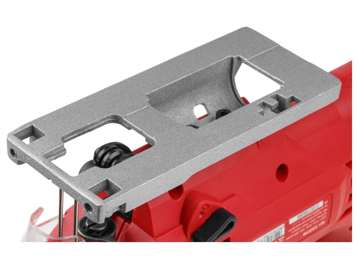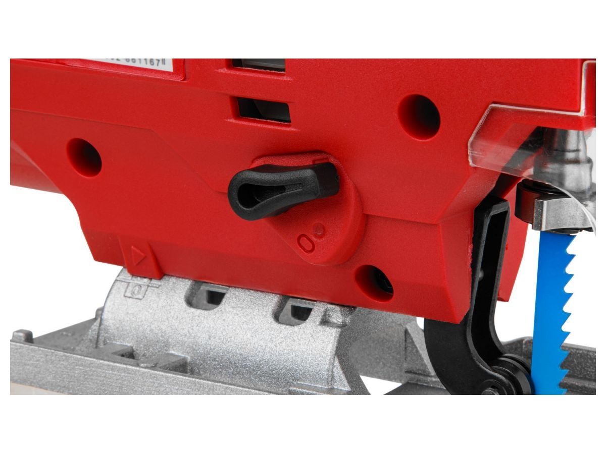 Лобзик оснащен удобной, эргономичной прорезиненной рукояткой, для быстрой замены пильных полотен предусмотрен быстрозажимной патрон, наличие маятникового движения с направляющим роликом, позволяет производить быстрые и при этом ровные пропилы. Литая алюминиевая подошва регулируется под разными углами. Возможно подключение пылесоса. Регулировка скорости позволяет использовать лобзик для реза различных материалов. Есть подсветка рабочей зоны.