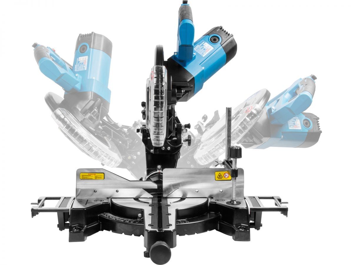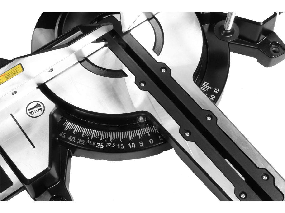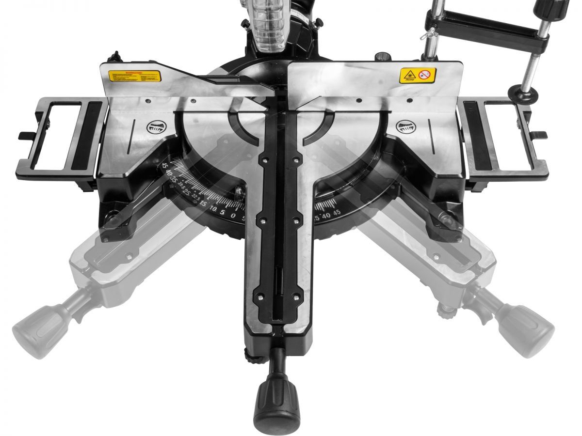 Торцовочная пила имеет функцию наклона пильной головы как влево, так и вправо, в диапазоне от 0 до 45. Кроме того, регулируется и нижнее основание влево и вправо, в диапазоне от 0 до 45. Так же есть функция быстрой фиксации нижнего поворотного стола под углами в: 0, 22.5, 31.6, 45, как влево, так и вправо.
