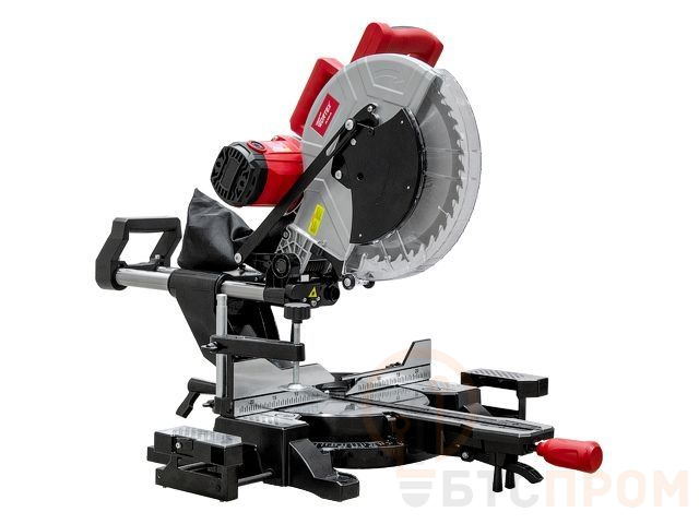 На пиле установлен мощный двигатель с ременной передачей, что в свою очередь делает его более надежным и менее шумным, имеется система пылеудаления, лазерный указатель для более точного реза, металлические скользящие полозья, плавный ход реза, система быстрого зажима заготовки, точный рез. Быстрая регулировка глубины и ширины реза. Правыйлевый наклон пильной головы. А так же наличие ребер жесткости в основании придает дополнительную мощность конструкции, что очень важно для торцовочной пилы.