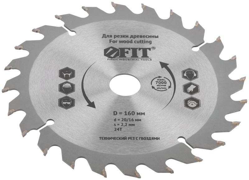 –Диск пильный для циркулярных пил по дереву 160х20/16х24T технический рез с гвоздями FIT 37702