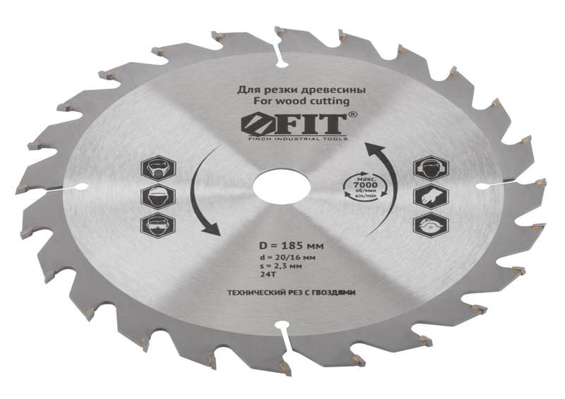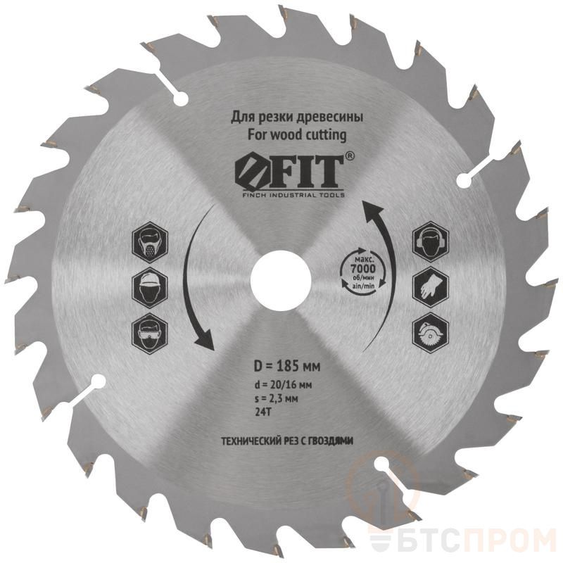 –Диск пильный для циркулярных пил по дереву 185х20/16х24T технический рез с гвоздями FIT 37704