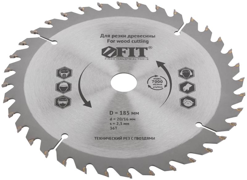 –Диск пильный для циркулярных пил по дереву 185х20/16х36T технический рез с гвоздями FIT 37705