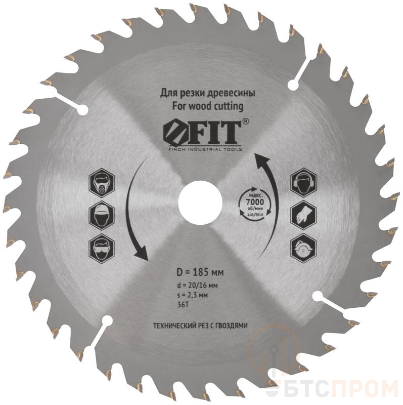 Диск пильный для циркулярных пил по дереву 185х20/16х36T технический рез с гвоздями FIT 37705 фото в каталоге от BTSprom.by