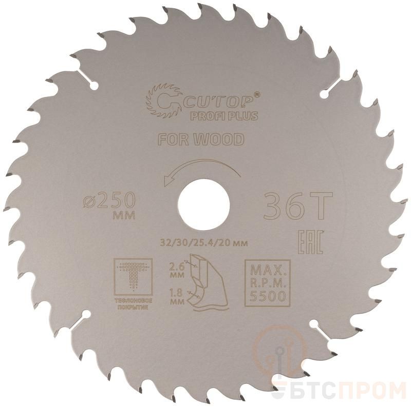 Диск пильный по дереву с тефлоновым покрытием 36Т Profi plus 250х1.8/2.6х32/30/25.4/20мм Cutop 75-25036Т