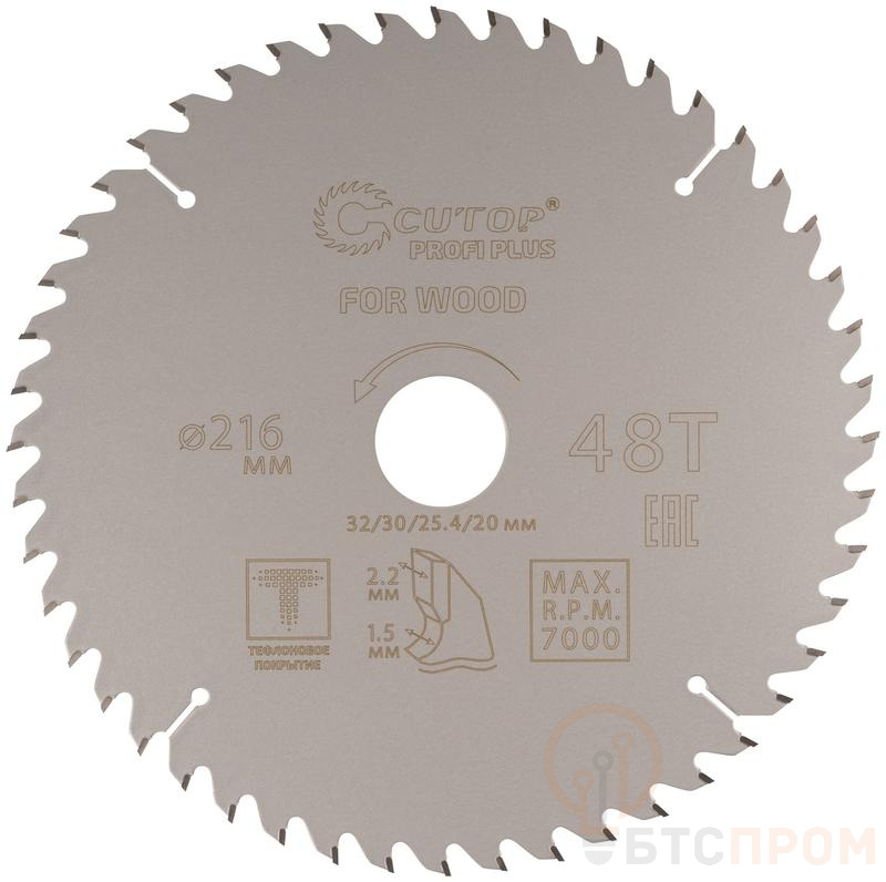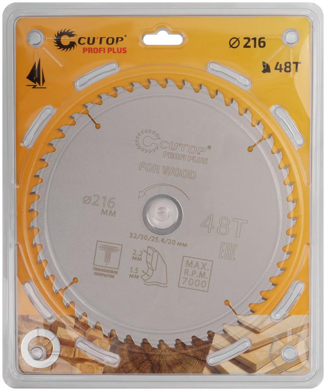 Диск пильный по дереву с тефлоновым покрытием 48Т Profi plus 216х1.5/2.2х32/30/25.4/20мм Cutop 75-21648Т