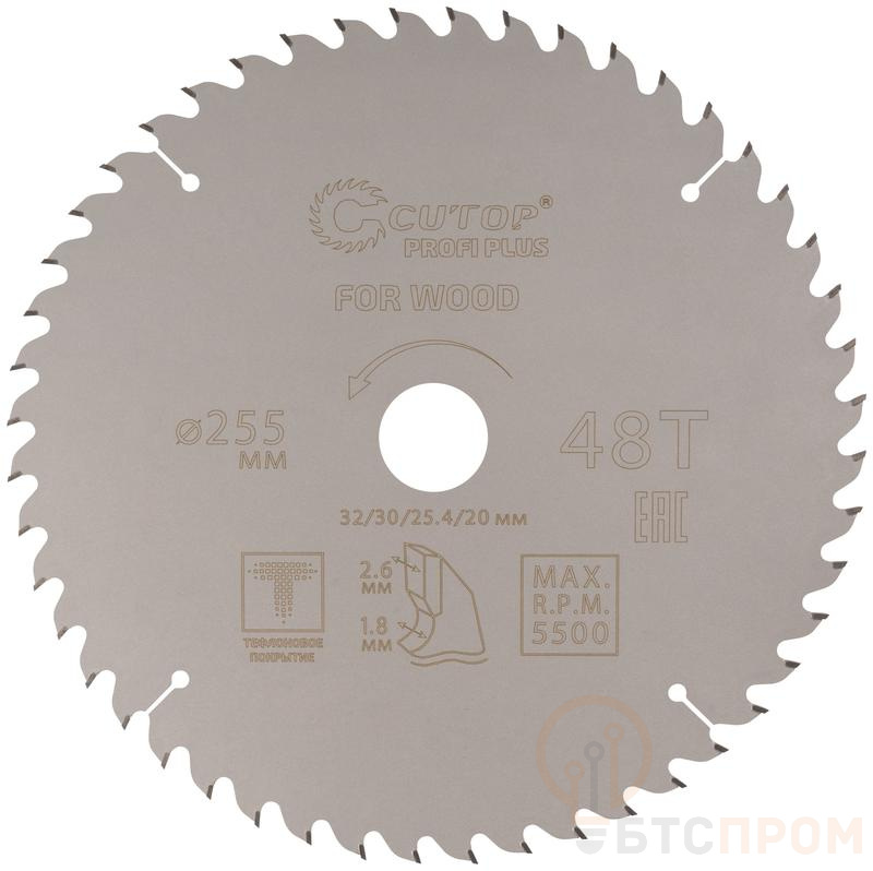 Диск пильный по дереву с тефлоновым покрытием 48Т Profi plus 255х1.8/2.6х32/30/25.4/20мм Cutop 75-25548Т