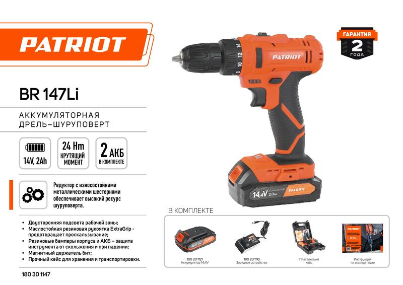 Дрель-шуруповерт аккумуляторная BR 147Li 2 АКБ Li-Ion 14.4В 2А.ч 2 скорости (кейс) PATRIOT 180301147