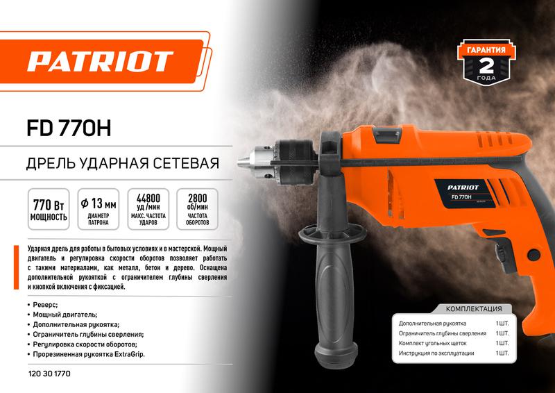 Дрель электрическая ударная FD 770H 770Вт 2800об/мин 44800уд/мин макс. диаметр сверления 13мм PATRIOT 120301770