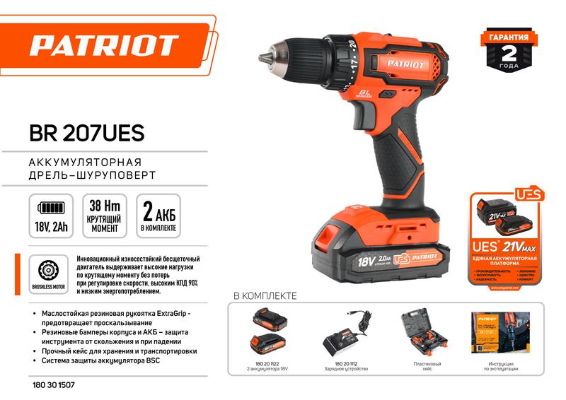 Дрель-шуруповерт аккумуляторная бесщеточная BR 207UES BL две АКБ Li-Ion 18В 2.0Ач 38Нм 2 скорости кейс PATRIOT 180301507