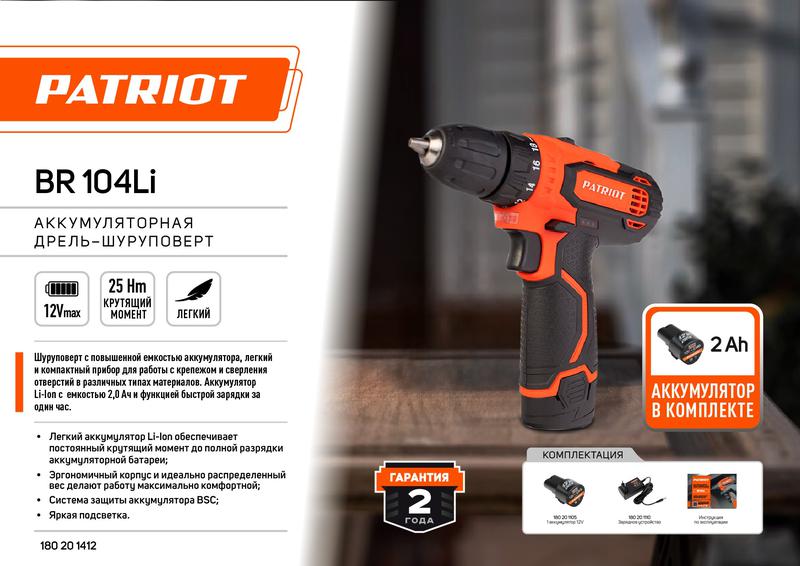 –Дрель-шуруповерт аккумуляторная BR 104Li 1 АКБ Li-Ion 12В 2.0Ач 2 скорости PATRIOT 180201412