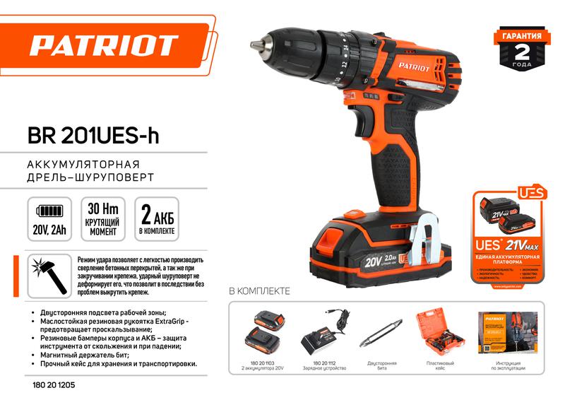 Дрель-шуруповерт аккумуляторная BR 201UES-h две АКБ Li-Ion 20В 2.0Ач 30Нм УДАРНЫЙ 2 скорости кейс PATRIOT 180201205