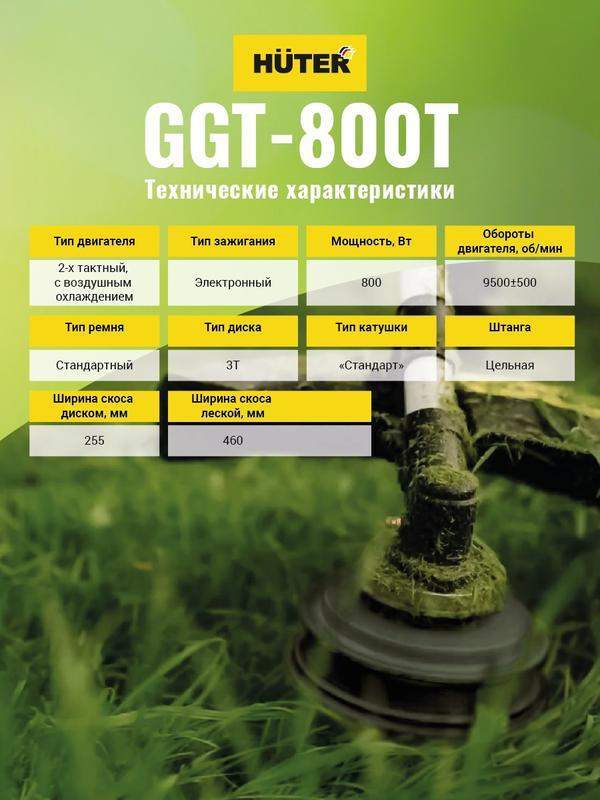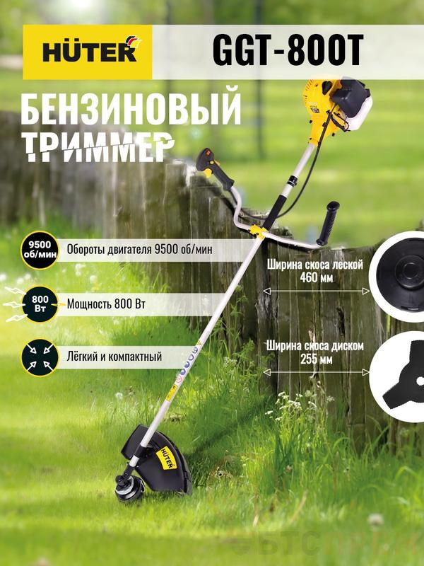 Триммер бензиновый HUTER GGT-800T - надежный инструмент для скашивания травы. Представляет собой современный вариант традиционного для этого вида работ ручного инструмента - косы. Этот триммер небольшой мощности, бюджетный вариант. Однако многие дачники отдают приоритет этой бензиновой модели, ведь не везде есть электричество, а провода создают дополнительное неудобство. Модель триммера GGT-800T отличается от GGT-800S только неразъёмной (литой) штангой, остальные параметры одинаковые. Преимущества: - Бензиновый триммер Huter обладает полной автономностью, можно работать где угодно без связи с источниками энергии. - Топливный бак устройства полупрозрачен и позволяет визуально следить за уровнем его наполнения. - Удобная рукоятка позволяет регулировать параметры агрегата, прочно его удерживать, а так же направлять его рабочую часть в нужное место. - Разборная штанга делает триммер компактным в сложенном состоянии, удобным для перевозки или хранения. - Надежный и оборотистый двухтактный двигатель с системой антивибрации и легким ручным запуском позволяет долго работать. - Управление триммером расположено прямо на рукоятке. Система безопасности: - Защитный кожух оберегает от отскоков камней и другого мелкого мусора в сторону пользователя. - Блокиратор курка газа позволяет избежать случайного нажатия курка и вращения режущего инструмента при заведенном двигателе. - Антивибрационная система триммера повышает комфорт при работе триммером.