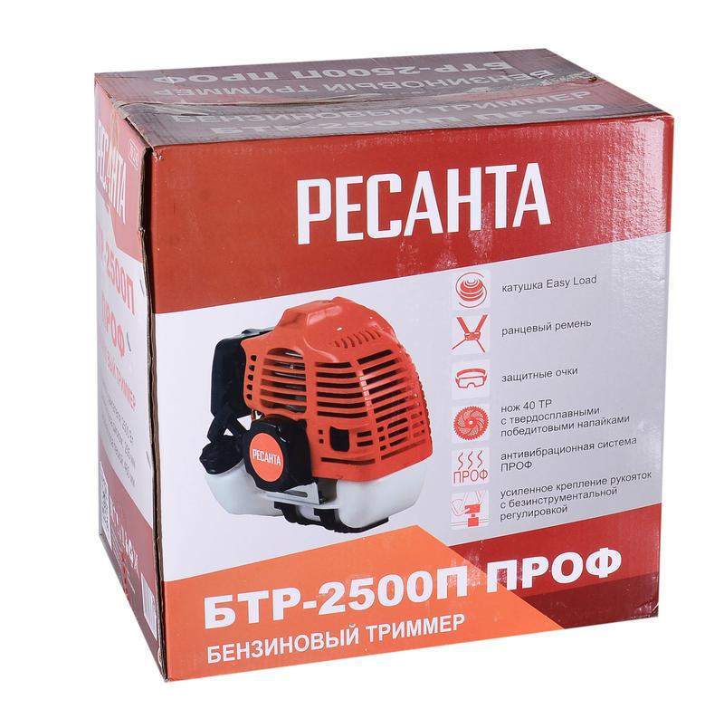 Бензотриммер БТР-2500П ПРОФ – незаменимый помощник для обладателей обширных земельных участков. Этот бензиновый триммер не только сам без устали работает, но и позволяет оператору с минимальными усилиями обработать огромные площади. Инструмент окажет помощь в скашивании травы, удалении сорных кустарников и даже молодой поросли деревьев. Преимущества БТР-2500П ПРОФ: надежность и мощность двухтактного двигателя (2500 Вт) обеспечивается качеством сборки, хромированным покрытием поршневой группы, электронным зажиганием и системой воздушного охлаждения. простота конструкции бензотриммера БТР-2500П ПРОФ, компенсация вибрации версии PROF, прочная штанга из легкого алюминия. нож 40ТР легко срежет кусты и молодые побеги деревьев. удобный доступ к обслуживанию свечи зажигания и воздушному фильтру, замена лески без разборки головки («Easy Load»), регулируемая винтом рукоятка с эргономическими ручками и регулируемый под рост ранцевый ремень, быстрый запуск и кнопка блокировки случайного запуска. защитные очки и емкость для смешивания топливной смеси – приятный бонус в комплекте. Для приготовления топливной смеси производитель рекомендует использовать фирменное полусинтетическое моторное масло для двухтактных двигателей «HUTER 2T». Основные характеристики: Антивибрационная система Есть Бренд Ресанта Число оборотов, об/мин 9500±500 Мощность, Вт 2500 Габариты упаковки 0.31 ? 0.32 ? 0.23 м Разъемная штанга Нет Ширина скоса диском, мм 255 Ширина скоса леской, мм 460 Тип диска 40ТР Тип двигателя 2-х тактный, с воздушным охлаждением Тип катушки Easy Load Тип ремня Ранцевый Уровень звукового давления, дБ 96 Вес, кг 9.385 кг Зажигание электронное (CDI) Защитные очки Есть