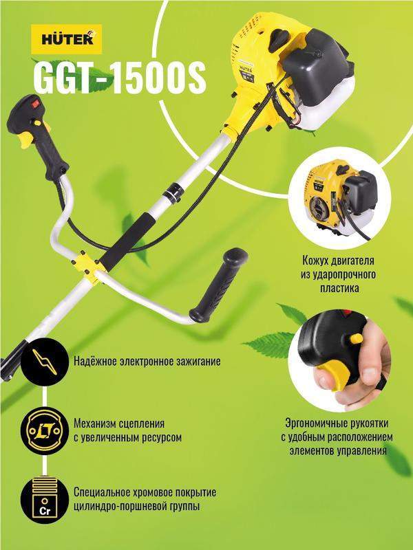 Триммер бензиновый HUTER GGT-1500S - отличный инструмент для скашивания низкой и высокой травы. Представляет собой современный вариант традиционного для этого вида работ ручного инструмента - косы. Часто дачники отдают приоритет этой бензиновой модели, ведь не на каждом участке есть электричество, а провода создают дополнительное неудобство. Мощность триммера позволяет снимать высокую траву и кустарники. Модель триммера GGT-1500S отличается от GGT-1500T только разъёмной (разборной) штангой, остальные параметры одинаковые. Преимущества: - Бензиновый триммер Huter обладает полной автономностью, можно работать где угодно без связи с источниками энергии. - Топливный бак устройства полупрозрачен и позволяет визуально следить за уровнем его наполнения. - Удобная рукоятка позволяет регулировать параметры агрегата, прочно его удерживать, а так же направлять его рабочую часть в нужное место. - Разборная штанга делает триммер компактным в сложенном состоянии, удобным для перевозки или хранения. - Надежный и оборотистый двухтактный двигатель с системой антивибрации и легким ручным запуском позволяет долго работать. - Управление триммером расположено прямо на рукоятке. Система безопасности: - Защитный кожух оберегает от отскоков камней и другого мелкого мусора в сторону пользователя. - Блокиратор курка газа позволяет избежать случайного нажатия курка и вращения режущего инструмента при заведенном двигателе. - Антивибрационная система триммера повышает комфорт при работе триммером.