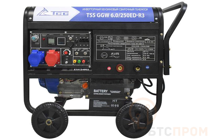 Инверторный сварочный генератор TSS GGW 6.0/250ED-R3 — это мощное и надежное решение для профессионального использования в условиях отсутствия централизованного электроснабжения. Аппарат оснащен бензиновым двигателем и сочетает в себе функции электростанции и современного сварочного инвертора.