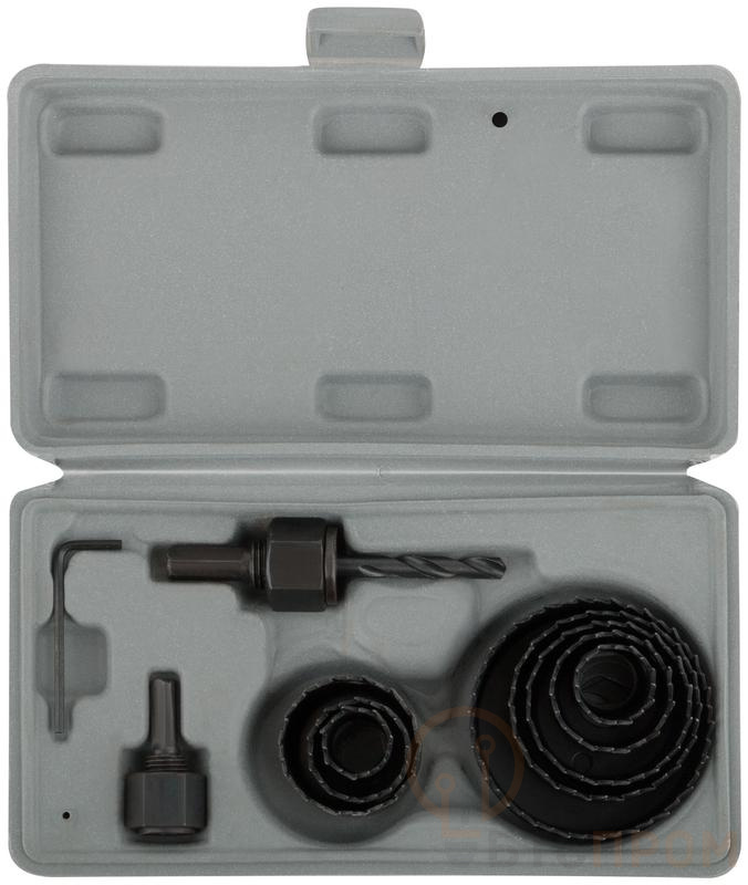 Для вырезания отверстий в древесине, фанере, ДСП, ДВП. В наборе: 8 круговых пил (19-22-28-32-38-44-51-64мм), адаптер, направляющее сверло. Зубья пил разведены и заточены. Материал: термообработанная инструментальная сталь. Уп: пластиковый кейс.