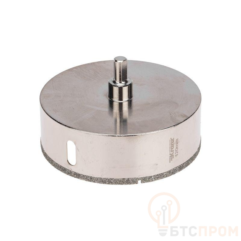 Алмазная коронка диаметром 120 мм используется при сверлении керамогранита, керамики, стекла. Наличие центровочного сверла обеспечивает точное позиционирование коронки на поверхности и помогает избежать смещения во время работ. Покрытие алмазной коронки выполнено гальваническим способом в два слоя, что обеспечивает эффективное сверление и продолжительный рабочий ресурс инструмента. Равномерное распределение алмазов по режущей кромке гарантирует аккуратное сверление материала без трещин и сколов. Высота алмазного слоя в 6 мм обеспечивает высокую производительность, а трехгранный хвостовик – надежную фиксации в патроне. При использовании алмазных коронок для сверления отверстий необходимо охлаждение, которое достигается путем подачи воды в рабочую зону.