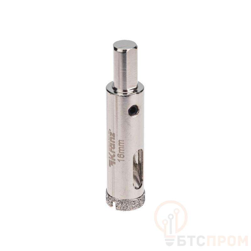 Алмазная коронка диаметром 16 мм используется при сверлении керамогранита, керамики, стекла. Наличие центровочного сверла обеспечивает точное позиционирование коронки на поверхности и помогает избежать смещения во время работ. Покрытие алмазной коронки выполнено гальваническим способом в два слоя, что обеспечивает эффективное сверление и продолжительный рабочий ресурс инструмента. Равномерное распределение алмазов по режущей кромке гарантирует аккуратное сверление материала без трещин и сколов. Высота алмазного слоя в 6 мм обеспечивает высокую производительность, а трехгранный хвостовик – надежную фиксации в патроне. При использовании алмазных коронок для сверления отверстий необходимо охлаждение, которое достигается путем подачи воды в рабочую зону.