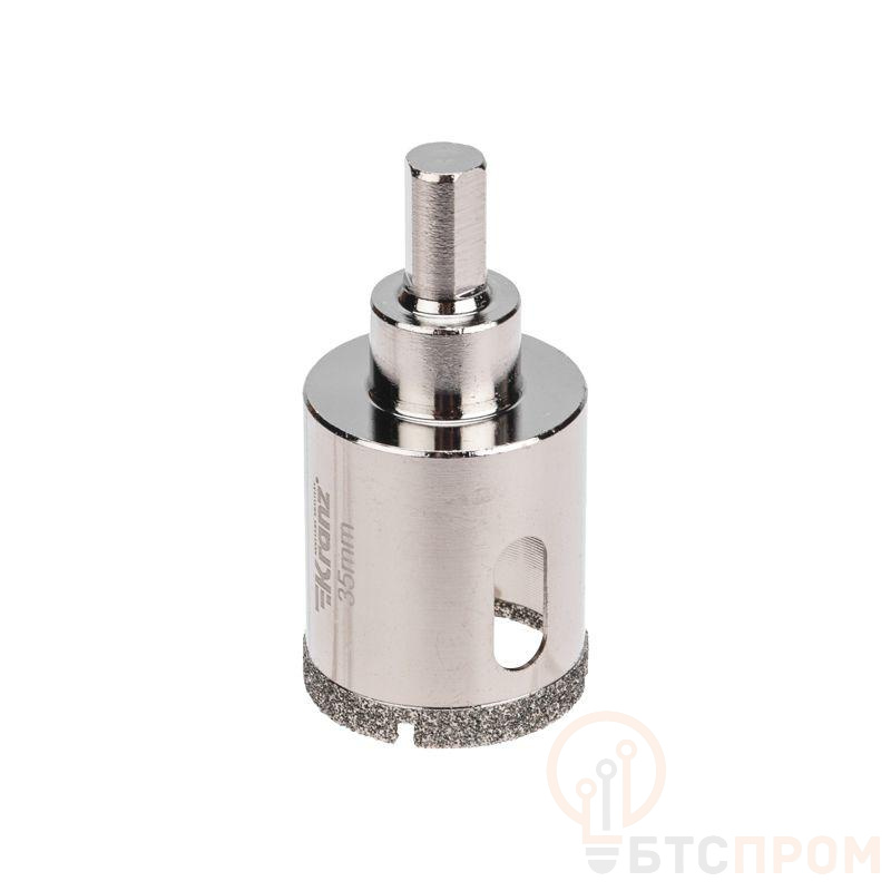 Алмазная коронка диаметром 35 мм используется при сверлении керамогранита, керамики, стекла. Наличие центровочного сверла обеспечивает точное позиционирование коронки на поверхности и помогает избежать смещения во время работ. Покрытие алмазной коронки выполнено гальваническим способом в два слоя, что обеспечивает эффективное сверление и продолжительный рабочий ресурс инструмента. Равномерное распределение алмазов по режущей кромке гарантирует аккуратное сверление материала без трещин и сколов. Высота алмазного слоя в 6 мм обеспечивает высокую производительность, а трехгранный хвостовик – надежную фиксации в патроне. При использовании алмазных коронок для сверления отверстий необходимо охлаждение, которое достигается путем подачи воды в рабочую зону.