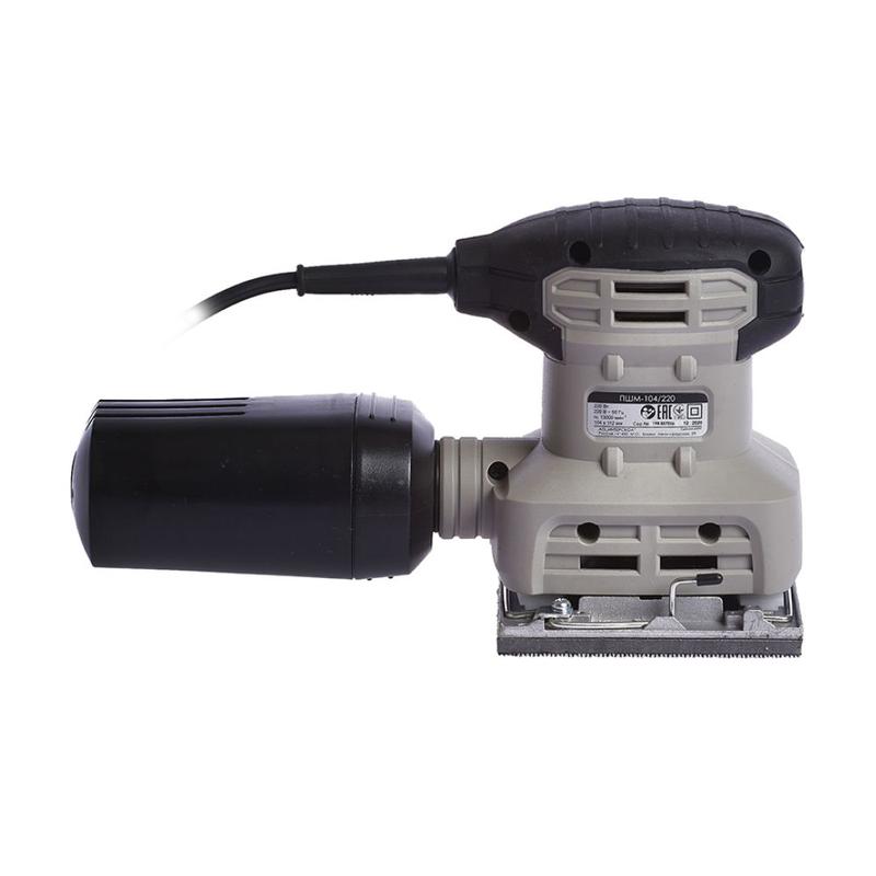 Агрегат работает от стандартной сети 220 В и оснащен удобной плоской подошвой, к которой крепятся абразивные сетки. Площадь подошвы составляет 114x230 мм, что позволяет эффективно обрабатывать значительные поверхности. Для комфортной работы инструмент имеет эргономичную рукоятку и систему плавного пуска.