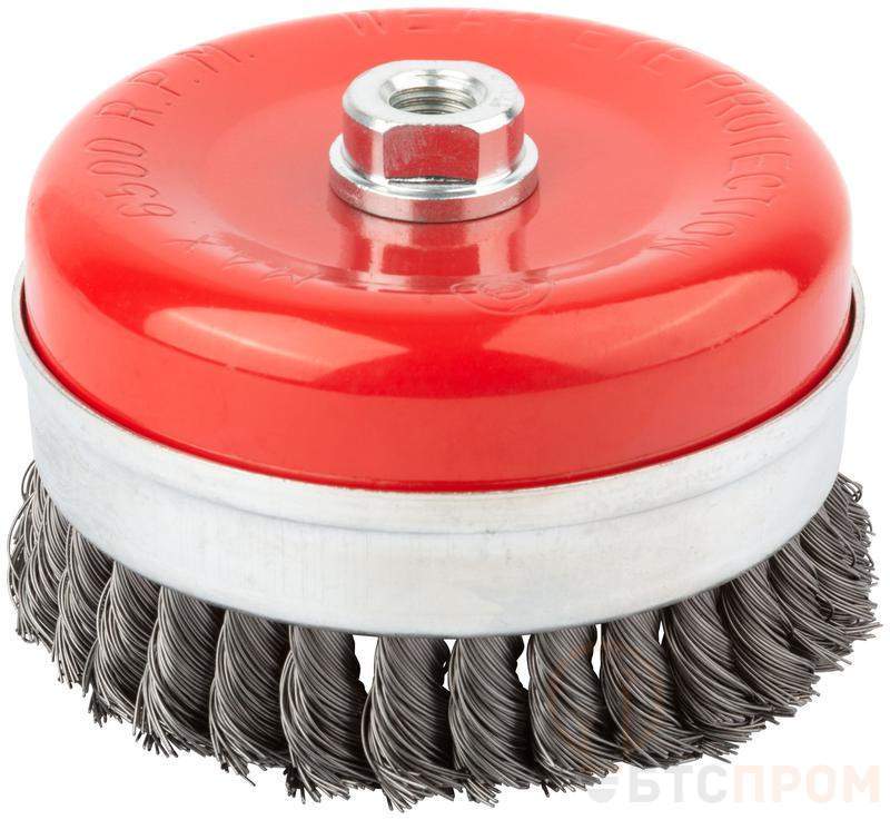Корщетка-насадка для УШМ FIT IT типа ‘’чашка’’ с металлическим бандажом предназначена для грубой обработки дерева и металла, снятия краски. Форма «чашка» обеспечивает хорошую площадь прилегания к поверхности. Витая проволока из нержавеющей стали обеспечивает высокую скорость и эффективность работы. Гайка с резьбой М14 обеспечивает прочную фиксацию на УШМ.