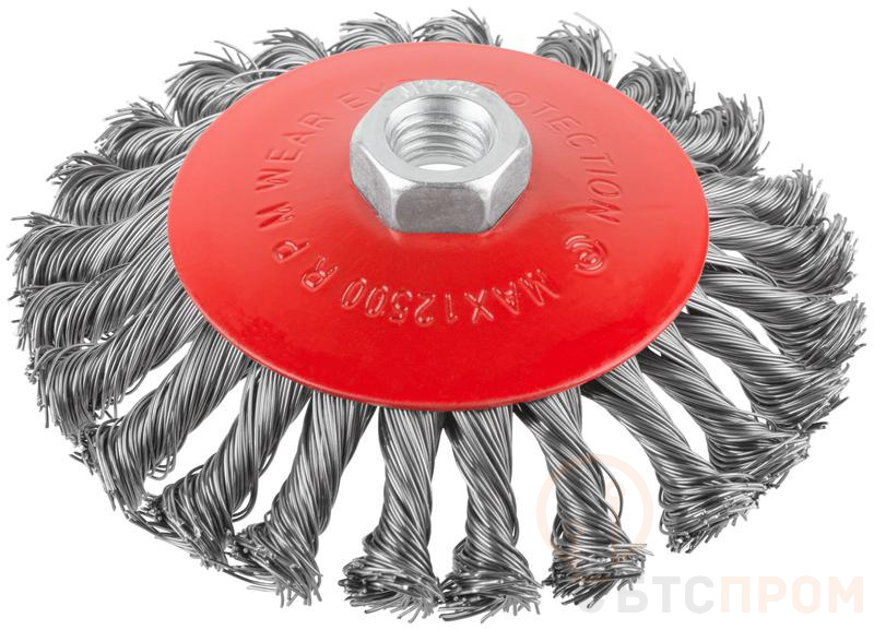 Тип "колесо", с наклоном. Для УШМ. Гайка М14. Материал: стальная витая проволока. Упаковка: картонная коробка.