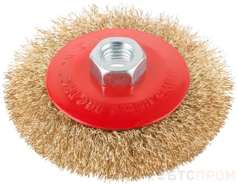 Тип "колесо", с наклоном. Для УШМ. Гайка М14. Материал: стальная латунированная волнистая проволока. Упаковка: картонная коробка.