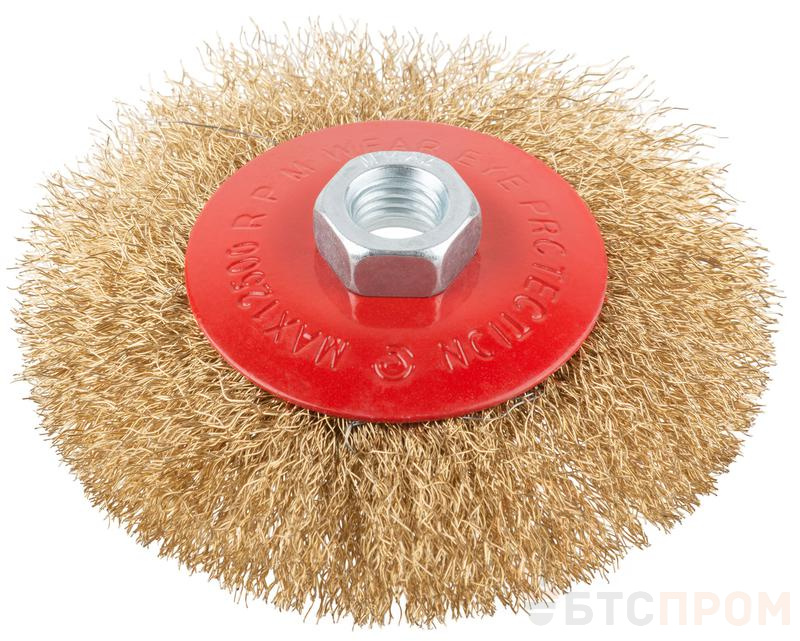 Тип "колесо", с наклоном. Для УШМ. Гайка М14. Материал: стальная латунированная волнистая проволока. Упаковка: картонная коробка.