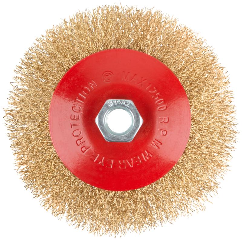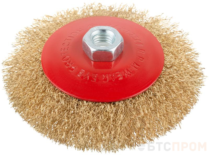 Тип "колесо", с наклоном. Для УШМ. Гайка М14. Материал: стальная латунированная волнистая проволока. Упаковка: картонная коробка.