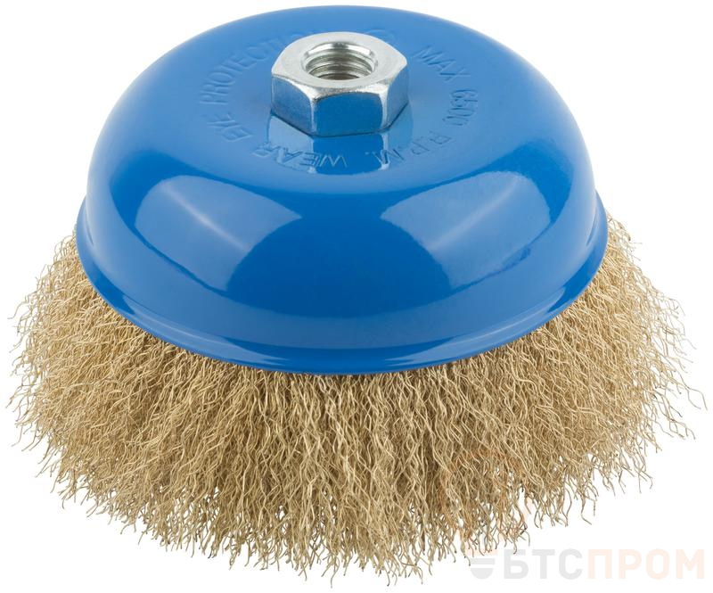 Тип «чашка». Для УШМ. Для очистки поверхностей от краски и ржавчины. Гайка М14. Латунированная волнистая проволока. Материал: инструментальная сталь. Упаковка: картонная коробка.