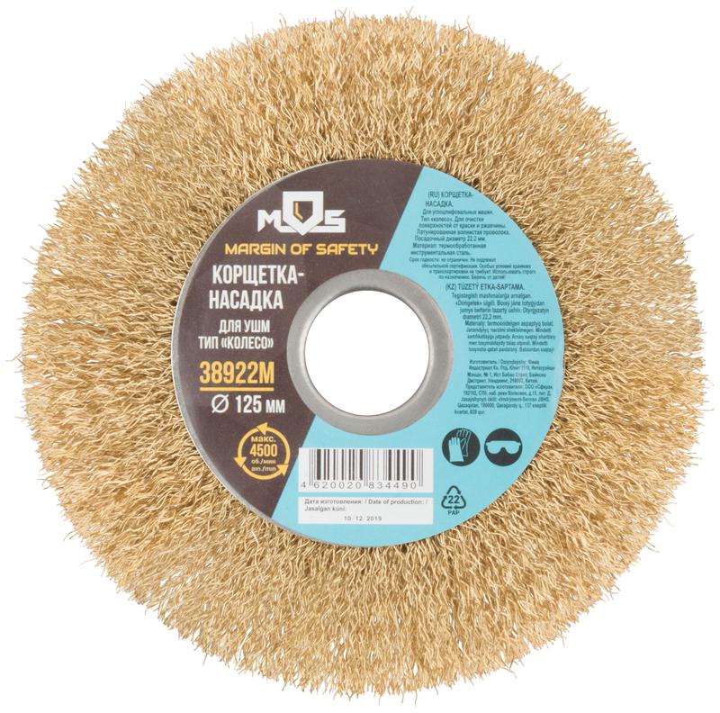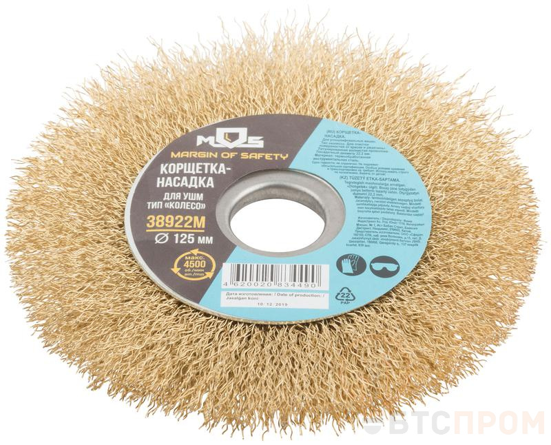 Корщетка тип "колесо" посадочный диаметр 22.2мм стальная латунированная волнистая проволока 125мм MOS 38922М