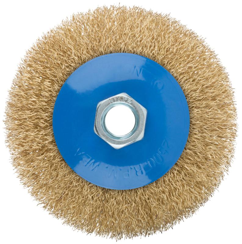 Корщетка тип "колесо" с наклоном гайка М14 стальная волнистая латунированная проволока 100мм MOS 38926М