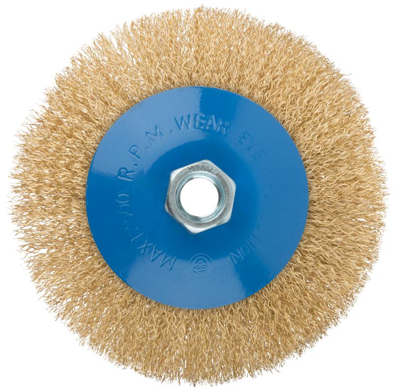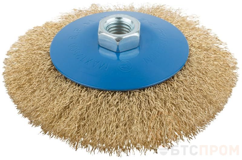 Корщетка тип "колесо" с наклоном гайка М14 стальная волнистая латунированная проволока 125мм MOS 38928М